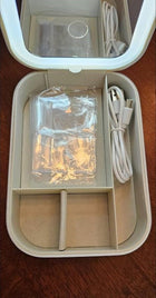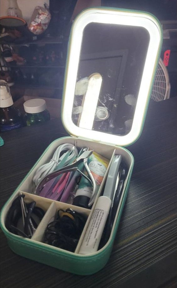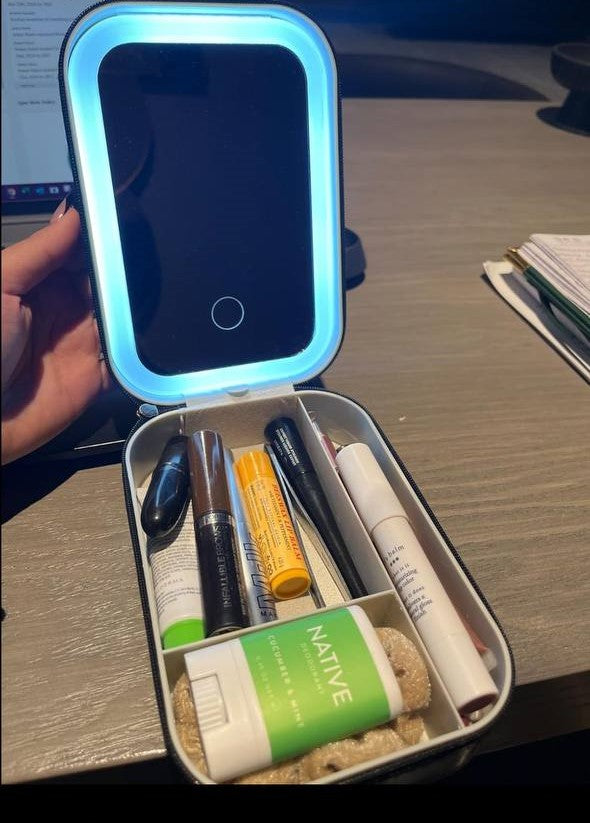 Je l'ai acheté pour plusieurs raisons. Il est compact, mais c'est un étui rigide protégeant ainsi votre maquillage. Le miroir est impressionnant avec plusieurs niveaux de luminosité. Il est livré avec un cordon de chargement USB. Je garde du maquillage dedans et je le garde dans une boîte à gants pour plus de commodité !